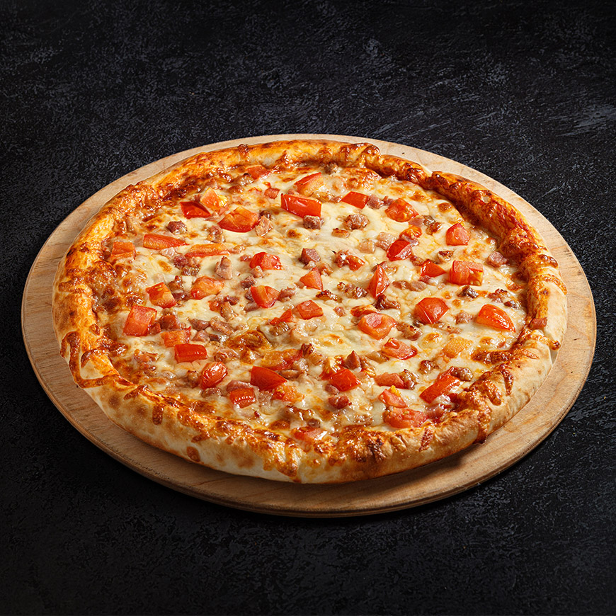 Размеры — 23 см. \ 32 см. Традиционное итальянское тесто, бекон, помидор, соус Томатный, сыр.